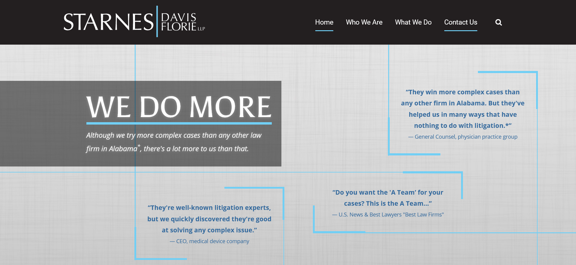 Headquartered in Birmingham Alabama the law firm Starnes Davis Florie LLP have a wide range of expertise and extensive experience in many practice areas that successful organizations need the most. As a client-centered firm with experience in highly complex legal matters their success has built up the resources of a large firm and a team of the best lawyers. They have done this while remaining efficient, nimble, and responsive problem solvers and crisis managers.